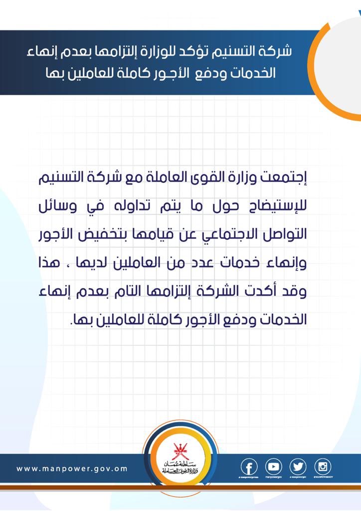 الاثنين ٣٠/مارس/٢٠٢٠ ٢٠:١٨ م القوى العاملة تؤكد إلتزام شركة التسنيم بدفع أجور العاملين لديها كاملة مسقط – الشبيبة أكدت شركة التسنيم تؤكد لوزارة القوى العاملة ، إلتزامها التام بعدم...