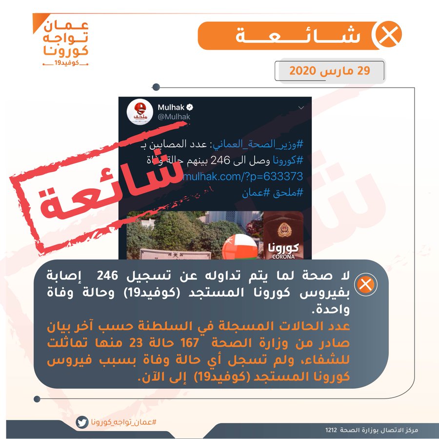 الأحد ٢٩/مارس/٢٠٢٠ ١٥:٣٩ م عمان تواجه كورونا ينفي "شائعة" مسقط - الشبيبة نفى الحساب الرسمي لعمان تواجه كورونا على "تويتر" ما يتم تداوله عن...