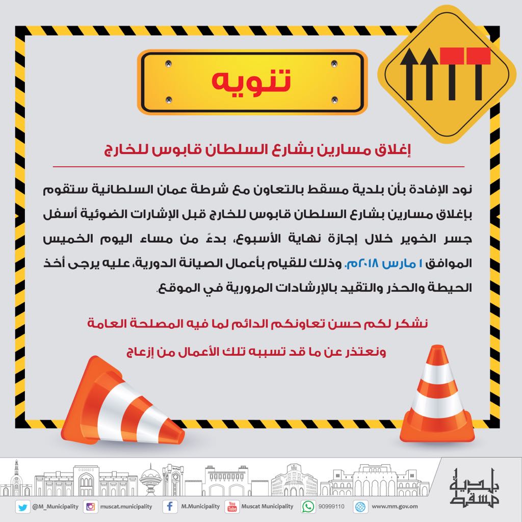 الخميس ٠١/مارس/٢٠١٨ ١٧:٣٢ م بلدية مسقط تصدر تنويها لسالكي شارع السلطان قابوس مسقط - ش أصدرت بلدية مسقط، الخميس، تنويها لسالكي شارع السلطان قابوس، مشيرة إلى أنها...