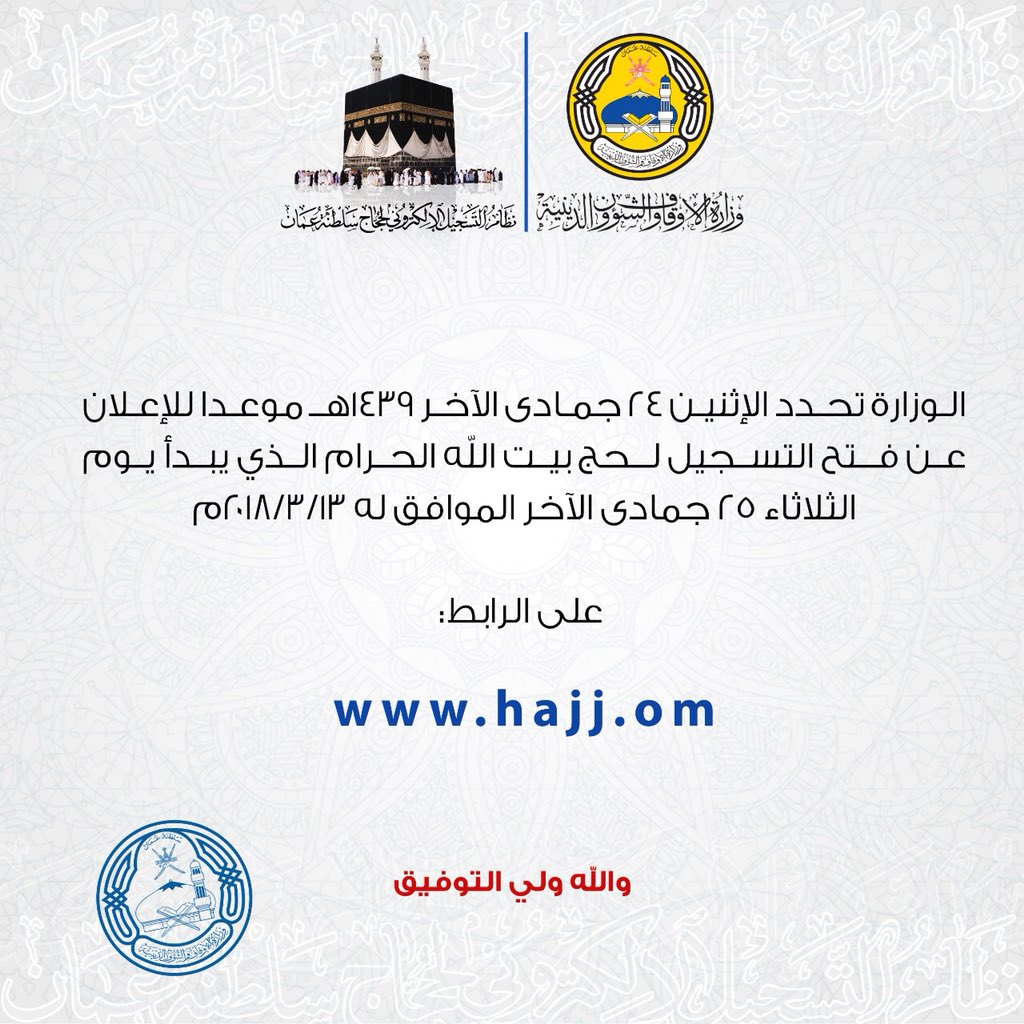الخميس ٠١/مارس/٢٠١٨ ١٥:٠٤ م تحديد موعد فتح باب التسجيل للحج مسقط - ش ذكرت وزارة الأوقاف والشؤون الدينية عبر حسابها الرسمي في "تويتر" أنها...