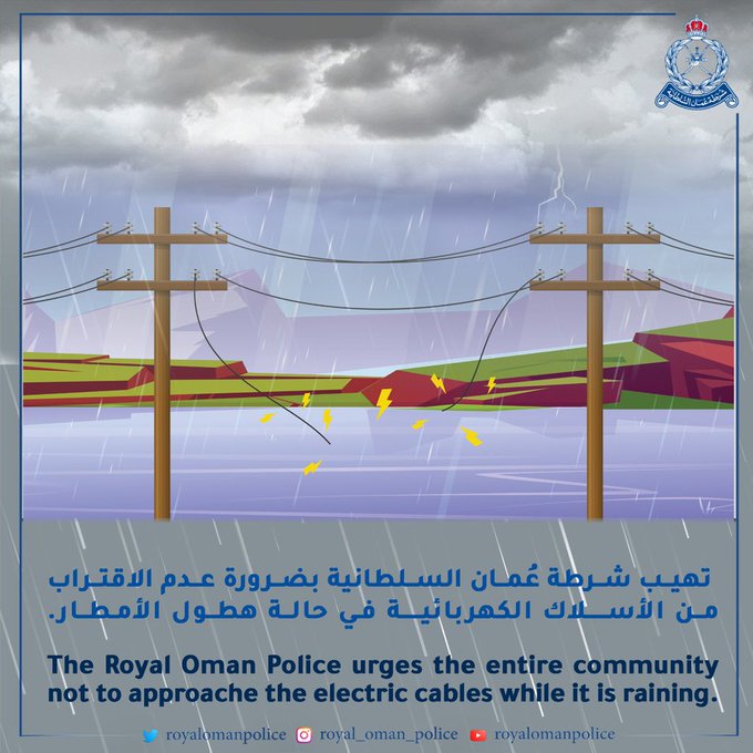 الثلاثاء ٢٦/يوليو/٢٠٢٢ ١١:٣٧ ص الشرطة تهيب بضرورة الابتعاد عن الأسلاك الكهربائية عند هطول الأمطار مسقط - الشبيبة تهيب شرطة عمان السلطانية بضرورة عدم الاقتراب من الأسلاك الكهربائية...