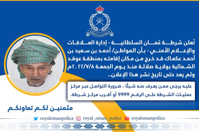الاثنين ١٨/يوليو/٢٠٢٢ ١١:١٠ ص الشرطة تعلن عن فقدان مواطن في صلالة مسقط - الشبيبة أعلنت شرطة عمان السلطانية عن فقدان مواطن بعد خروجه من مكان إقامته...