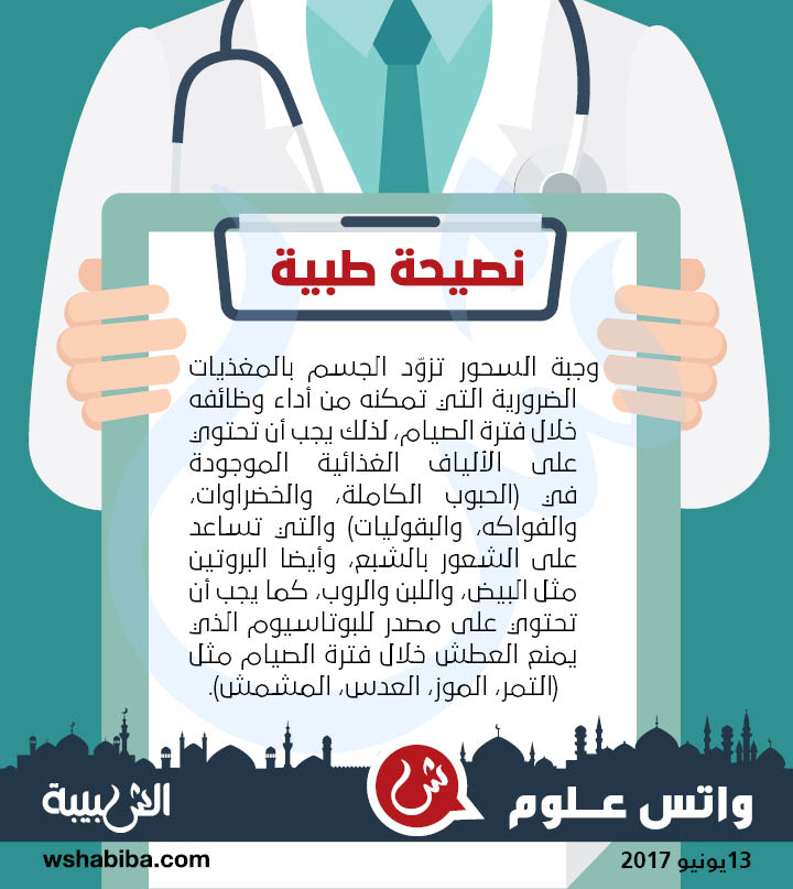 الثلاثاء ١٣/يونيو/٢٠١٧ ١٦:٥٤ م نصيحة طبية: ما الذي يجب تناوله في وجبة السحور؟ وجبة السحور تزوّد الجسم بالمغذيات الضرورية التي تمكنه من أداء وظائفه خلال فترة...