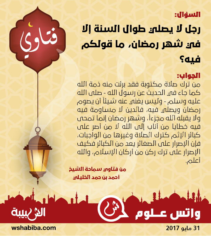 الأربعاء ٣١/مايو/٢٠١٧ ١٥:١١ م رجل لا يصلي طوال السنة إلا في شهر رمضان، ما قولكم فيه؟ من ترك صلاة مكتوبة فقد برئت منه ذمة الله كما جاء في الحديث عن رسول الله - صلى الله عليه...